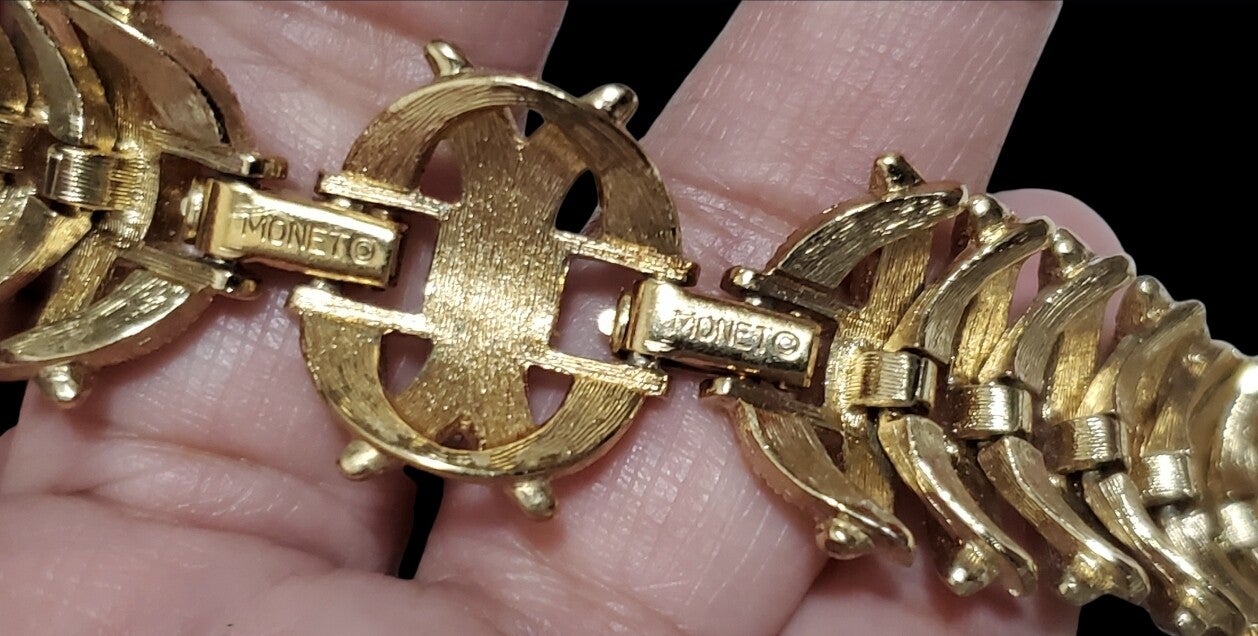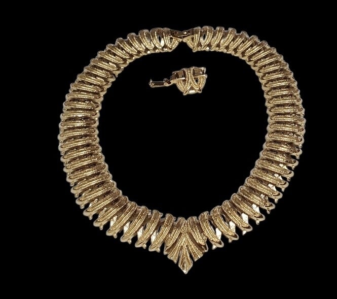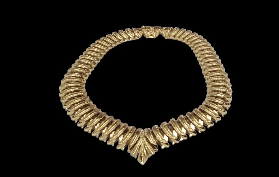 Elegant vintage monet choker nexklace. Gold plated brutalist mid-century custom necklace with the extra clasp extender closure. Link chain arranged in close feathers like.